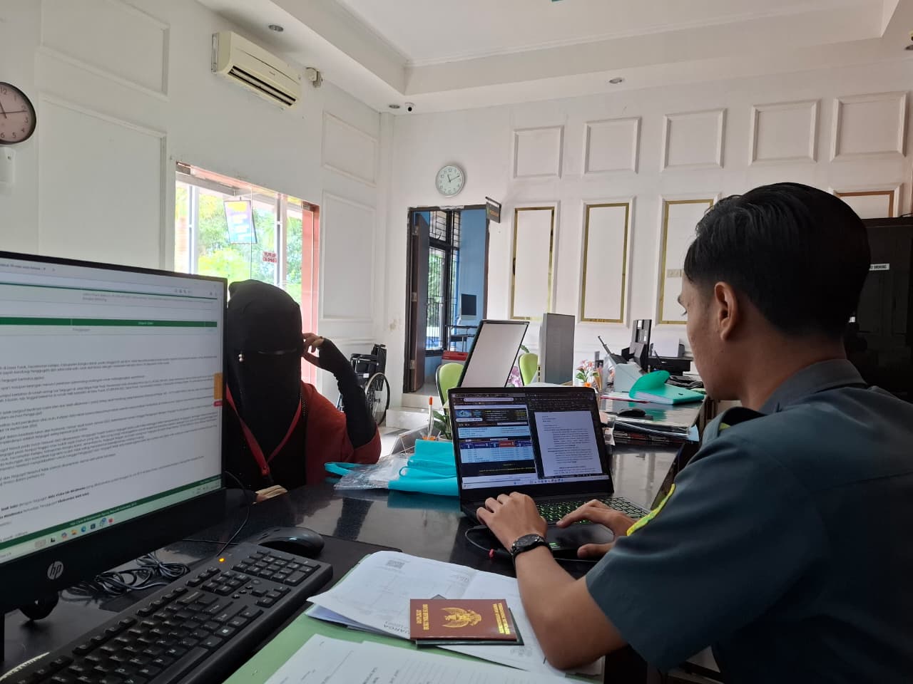 www.pa-mentok.go.id Mentok, 25 November 2025 Pelayanan Terpadu Satu Pintu (PTSP) Pengadilan Agama Mentok kembali menunjukkan dedikasi tinggi dalam memberikan pelayanan terbaik kepada masyarakat pencari keadilan. Suasana di ruang PTSP terpantau lancar dan tertib, dengan petugas yang sigap melayani berbagai keperluan administrasi perkara, termasuk kepada salah satu pihak berperkara yang datang untuk mengurus keperluannya. Sejak pagi hari, petugas di setiap loket PTSP, yang merupakan garda terdepan layanan publik, telah bersiap untuk melayani masyarakat sesuai dengan Standar Operasional Prosedur (SOP) yang berlaku. Salah satu pihak berperkara yang datang hari ini, terlihat mendapatkan penjelasan yang rinci dan terperinci mengenai tahapan perkaranya setelah proses registrasi.