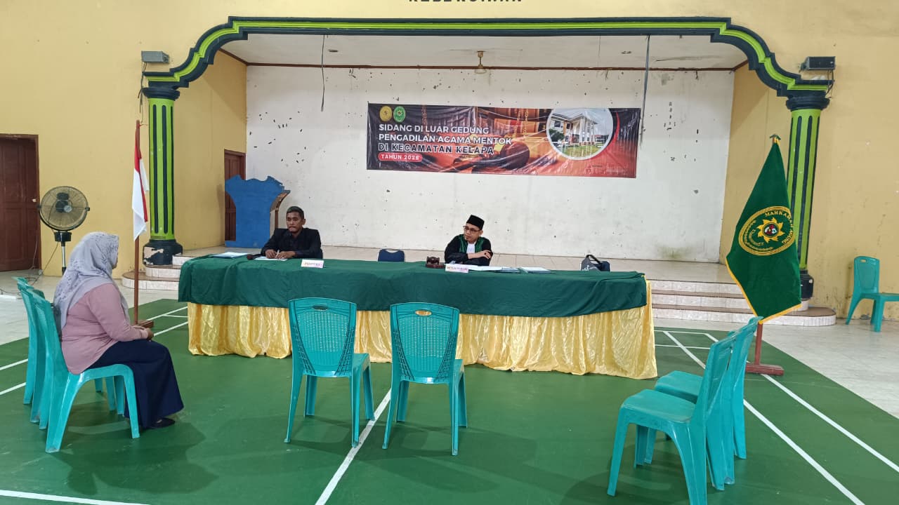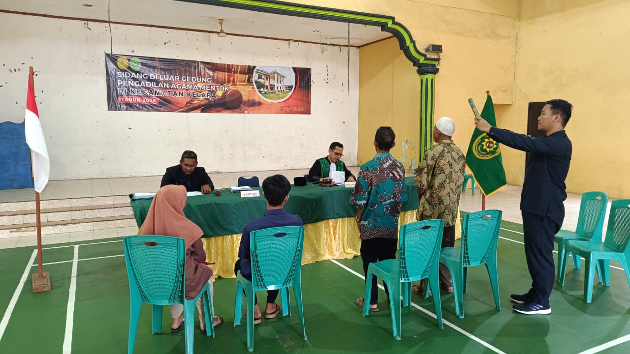 www.pa.mentok.go.id. Rabu, 04 Februari 2026, Pengadilan Agama Mentok memulai hari pertama pelaksanaan sidang di luar gedung yang bertempat di Kecamatan Kelapa, Kabupaten Bangka Barat. Kegiatan ini merupakan salah satu bentuk komitmen Pengadilan Agama Mentok dalam memberikan pelayanan peradilan yang mudah diakses oleh masyarakat, khususnya bagi para pencari keadilan yang berdomisili jauh dari gedung pengadilan.