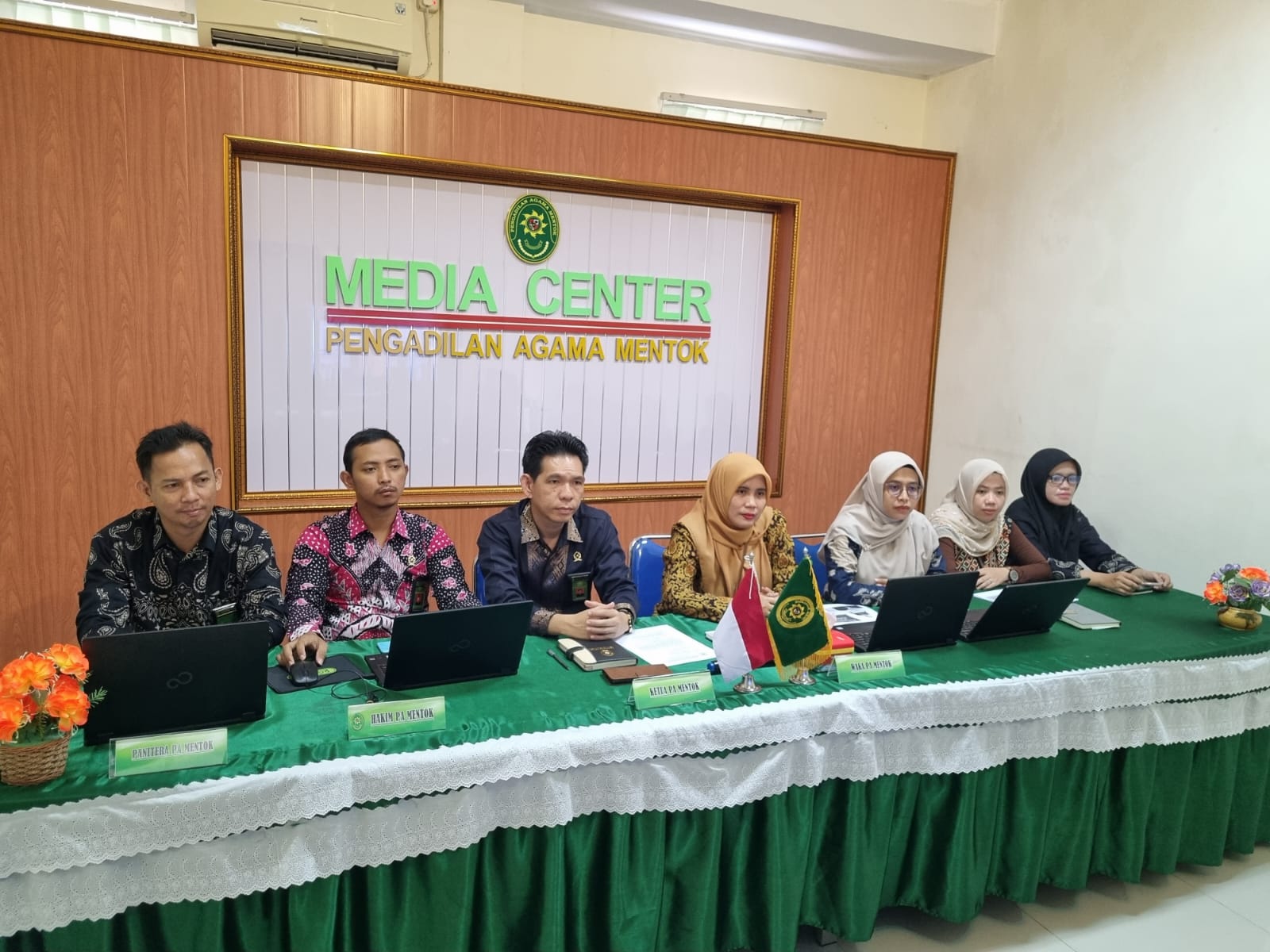 www.pa-mentok.go.id. || Mentok- Ketua Pengadilan Agama Adi Sufriadi, S.H.I. dan Wakil Ketua Pengadilan Agama Mentok Komariah, S.H.I., M.E. ikut serta dalam kegiatan zoom meeting yang diselenggarakan untuk Bimbingan Teknis Peningkatan Kompetensi Tenaga Teknis Peradilan Agama pada hari Jum’at 28 Juli 2023 di ruang Media Center Pengadilan Agama Mentok. Kegiatan ini diikuti oleh tenaga teknis Pengadilan Agama Mentok yang terdiri dari Hakim Pengadilan Agama Mentok Nailasara Hasniyati, S.H.I., M.S.I. dan M. Refi Malikul Adil, S.H., M.H. , Panitera Pengadilan Agama Mentok Supri, S.H.I., M.H., serta Plt. Panitera Muda Hukum Pengadilan Agama Mentok Danah, S.H.I. dan Panitera Muda Permohonan Pengadilan Agama Mentok Herly Oktarina, S.H., M.H.